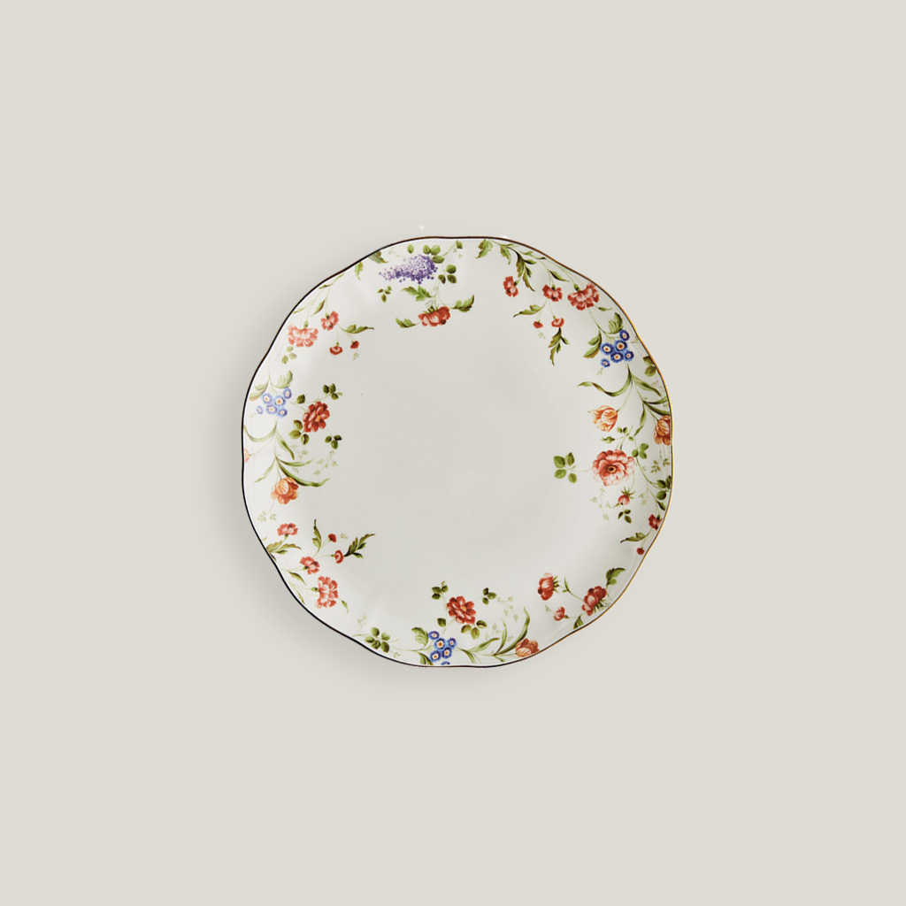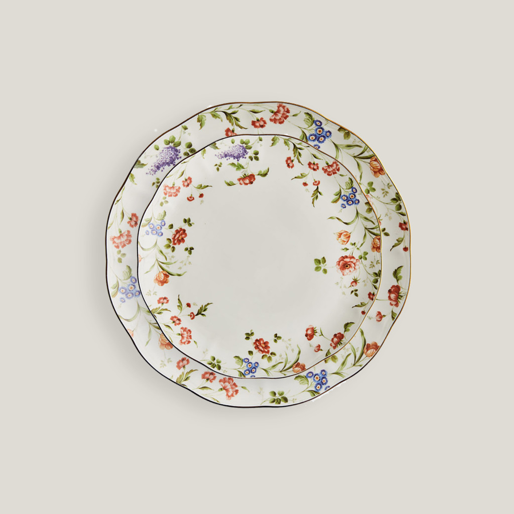 Featuring scalloped edges, vibrant bursts of color, and elegant metallic rims, the Cora Scalloped China Collection seamlessly integrates timeless design elements into your table setting.