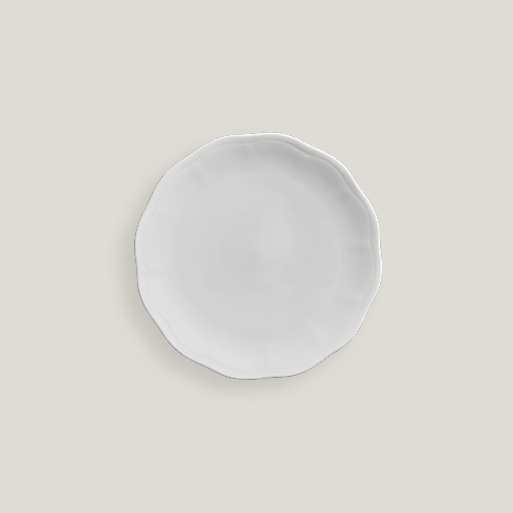 The Eloise Dishware Collection features embossed detailing and scalloped edges that define this comprehensive set. Simple yet stunning!