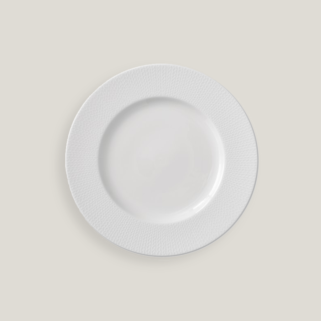 Mia’s elegance stems from refined understatement. A low profile creates the perfect plating space, while subtle embossing on the rim draws the eye inward. Dressed up or dressed down, this pattern has poise.
