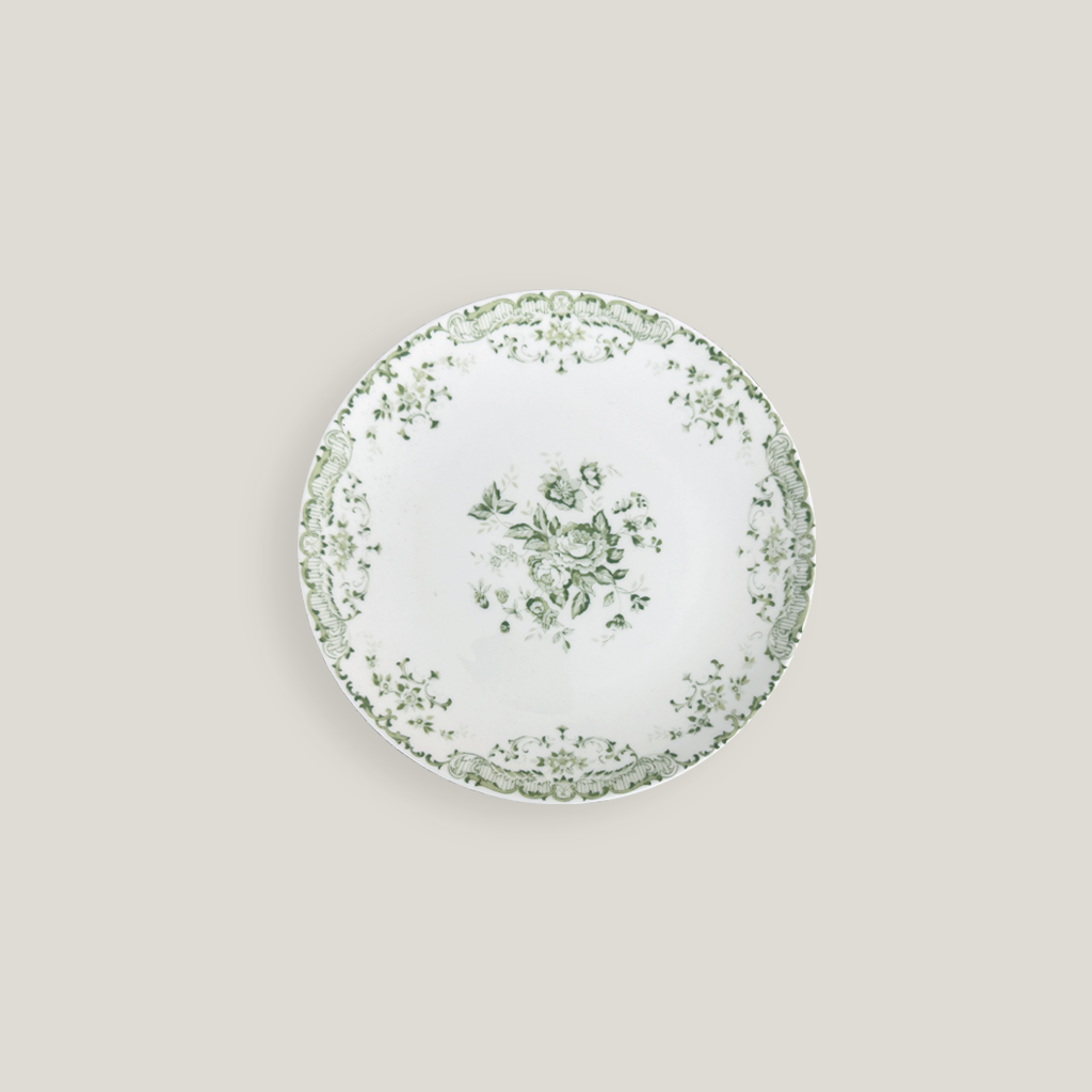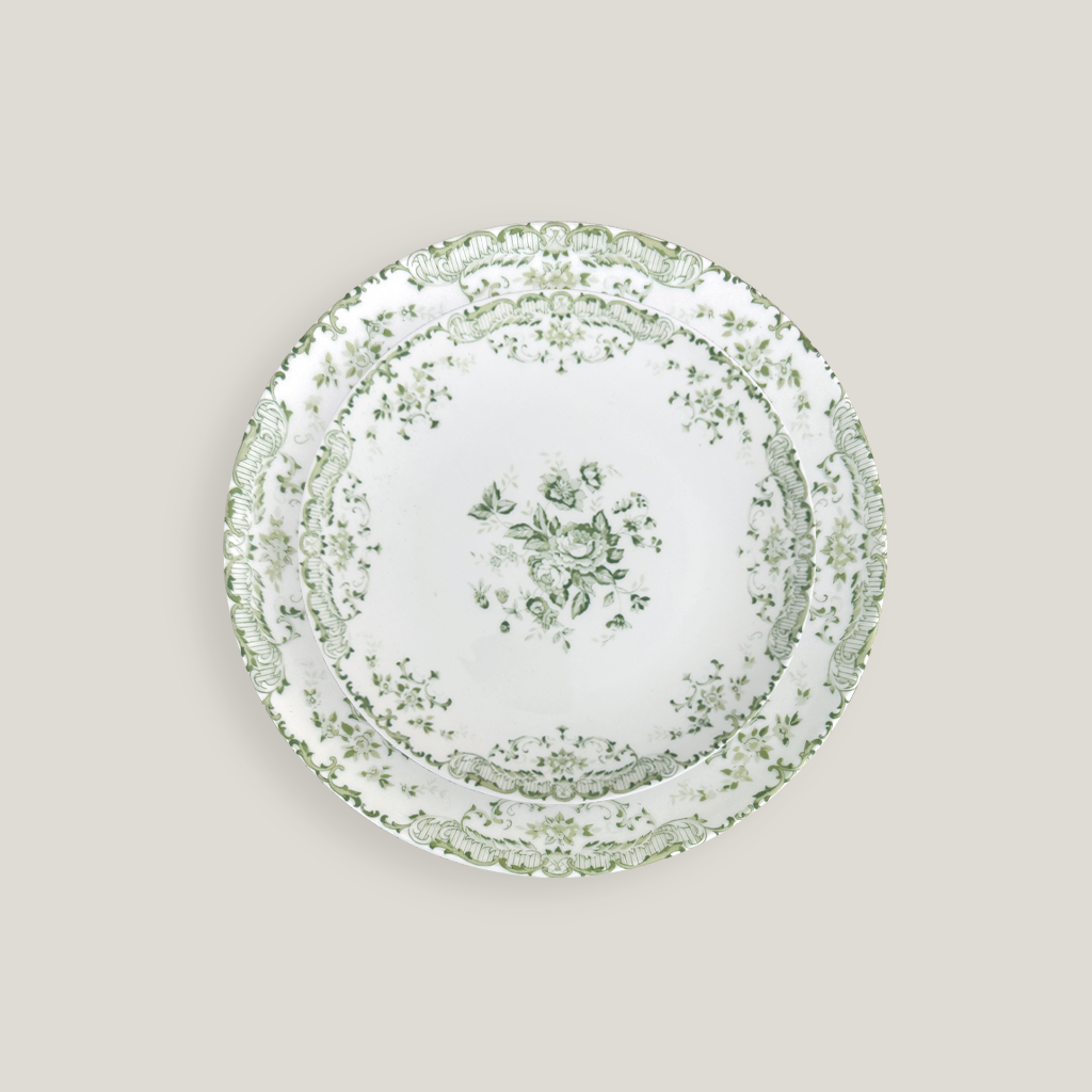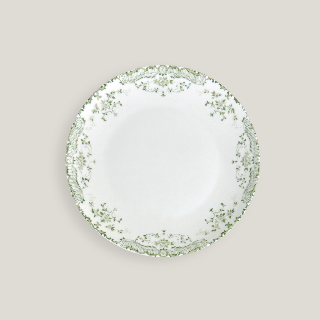 Infuse your event with timeless charm and a touch of nostalgia using the Nora Vintage China Collection. This exquisite dinnerware showcases delicate floral patterns in soft green tones, framed by intricate patterned edges that evoke the elegance of a bygone era.