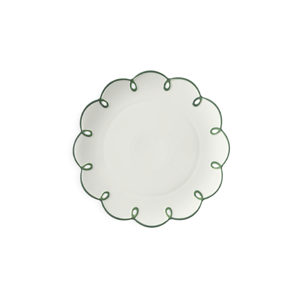 A fresh take on classic elegance, our Ivy Green Loop China Collection brings a crisp, tailored touch to any wedding or event. The soft white base is framed with a whimsical looping rim in deep ivy green—subtle, sculptural, and effortlessly refined.